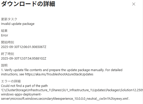 1. Verify update file contents and prepare the update package manually. For detailed instructions, see https://aka.ms/TroubleshootAzureStackUpdatesエラーの詳細