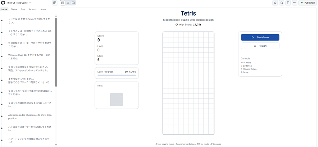 上記の画像は自然言語でテトリスの作成を指示したものとなりますが、実際のアプリケーションは こちら で公開しています。(投稿時点で公開したもので、どこかのタイミングで削除されている可能性もあります)