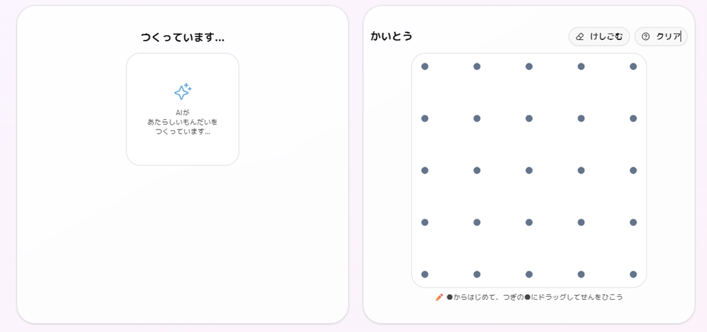 点つなぎゲームの生成を GitHub Spark に依頼すると、ランダムな形の見本を自動生成するコードを作成してくれるのですが、決まったパターンをハードコードし、その中からランダムで生成されるような方式が取られていました。