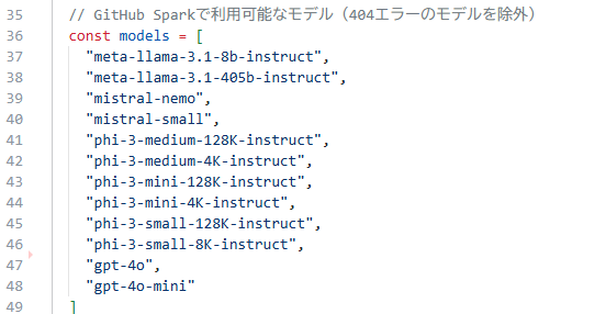 GitHub Spark では前述のとおり、GitHub Models のモデルを使用できると思いますが、@github/spark の /@github/spark/dist/llm.js に記載されているモデルが使用できると思っておけばよいのではないでしょうか。