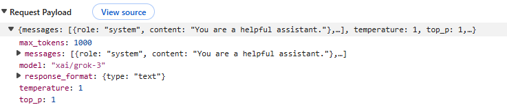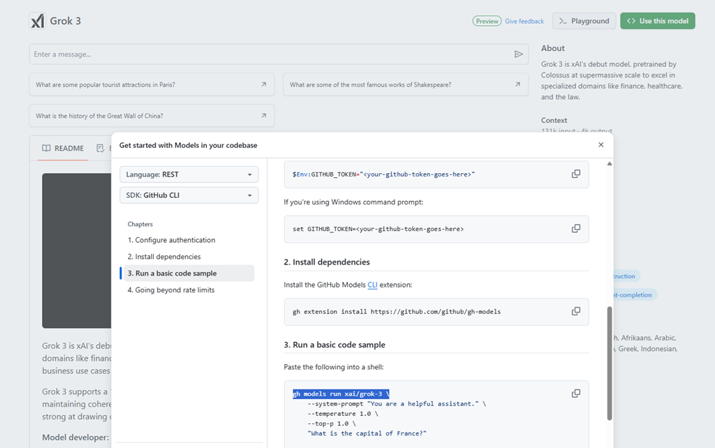 「Grok 3」であれば「xai/grok-3」で呼び出すことができます。(モデルの前のプレフィックスを省略することも可能なようですが、llm.js で GitHub Spark の初期バージョンのプレフィックスを省略した形だったものをプレフィックス付きに変換していますので、省略しないほうがよさそうです)