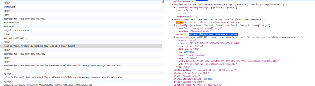 GitHub Spark のアプリケーションは https://github.com/github/spark-template をテンプレートとして作成されますが、「cloud_environment」の呼び出しを確認することでアプリケーション作成時の呼び出しを確認できそうでした。