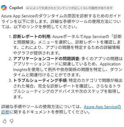 Copilot in Azure では汎用的な調査内容の提示となっていました。