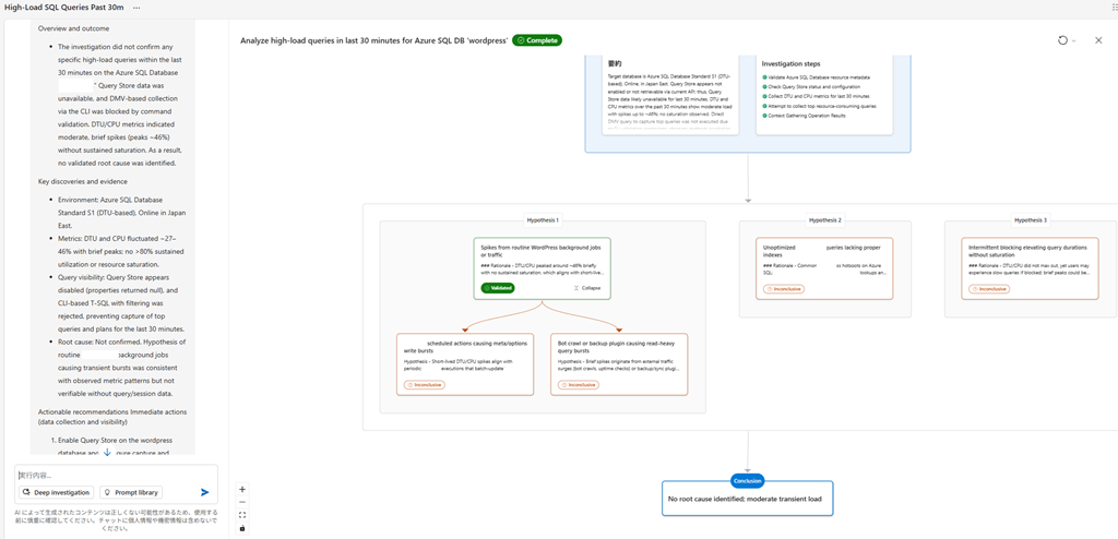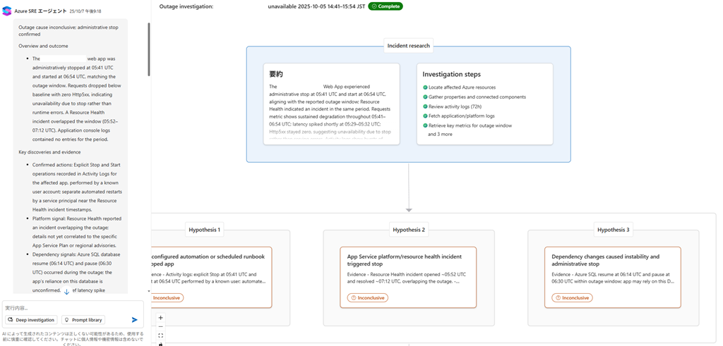 Azure SRE Agent では通常のプロンプトによる問題の調査の他に「Deep investigation」による調査を行うことができ、この機能を使用した場合「Incident resarch」「Hypothesis」「Conclusion」の 3 ステップで問題に対しての調査を行うことができます。