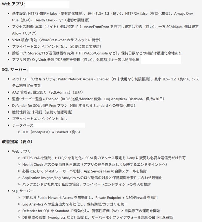 上記は発生している問題に対しての対応を依頼しましたが「xxxx のリソースグループのリソースについて、改善案を提示することはできますか?」というような、プロンプトを使用することもできますので、発生している問題に対してだけでなく、既存のリソースの調査についてのアプローチも実施することが可能です。