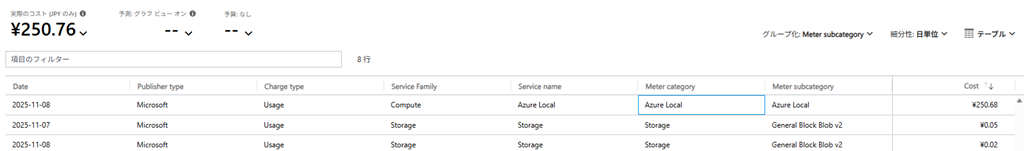 実際にコストが発生すると、次のようにメーターのカテゴリとしては、Azure Local のコストとして計上されていることが確認できます。