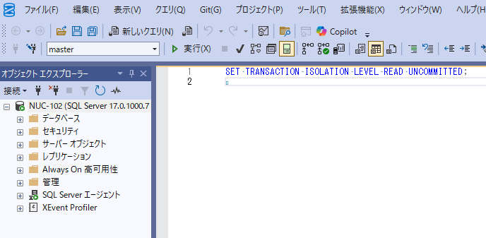 期待通りの実装が行えていると、新しいクエリエディターを開いた際に、次のように自動的にトランザクション分離レベルが追加されます。