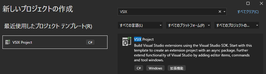 次に、Visual Studio で「VSIX Project」のプロジェクトを作成します。