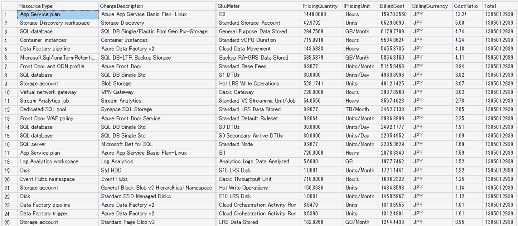 次の画像が実際にクエリを実行して取得した情報となります。(リソース名等に関しては削除しています)