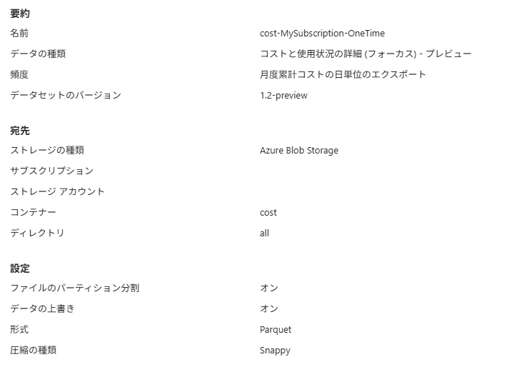 コストのエクスポートですが、Cost Management のエクスポート機能を使用して Parquet ファイルでストレージアカウントにエクスポートすることができます。
