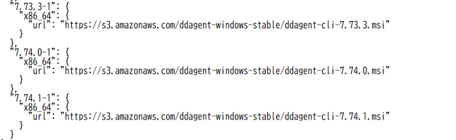 https://ddagent-windows-stable.s3.amazonaws.com/installers_v2.json で、提供されているインストーラーの一覧を確認することができます。