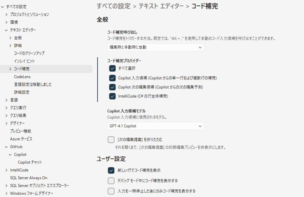 コード補完の有効化は「テキストエディター」->「詳細」->「コード補完」内にあり、Copilot による補完を有効化することでクエリエディター内で使用することができるようになります。