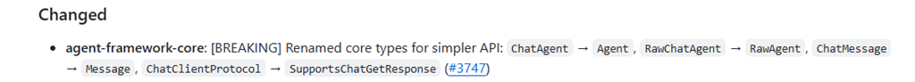 「2.」のサンプルは Agent Framework ではなく、OpenAI Agent SDK が使用されており、こちらのサンプルを使用した場合は、Agent Framework の破壊的変更の影響は受けずに、クイックスタートを一通り流すことができますので、「クイックスタートを実行して、どのような流れでエージェントを作成するのかを確認したい」ということであれば、本投稿時点では OpenAI Agent SDK 版のサンプルを使用したほうがよいかのではないでしょうか。
