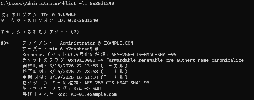 (「klist sessions | findstr "Network"」で情報を取得し、Windows 認証で使用しているドメインユーザーの情報を取得したものです)