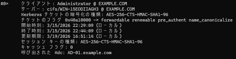 S4U のチケットの有効期間が 15 分となっており、この時間が経過した後にチケットの再取得が行われ、CIFS 向けの内容となっていることが確認できます。