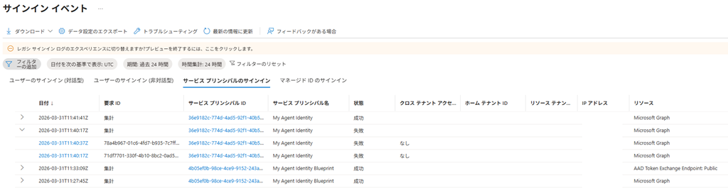 エージェント ID のサインインログはサービス プリンシパルのサインインとして記録されますが、「エージェント ID から Microsoft Graph へのサインイン」としてログが記録されています。