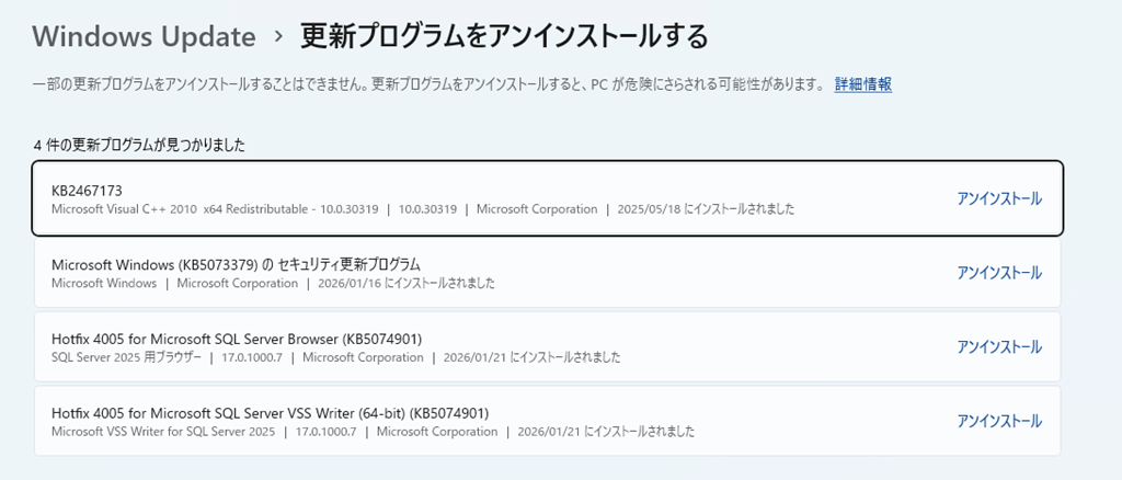 Windows Server 2025 で SQL Server の更新プログラムのアンインストール